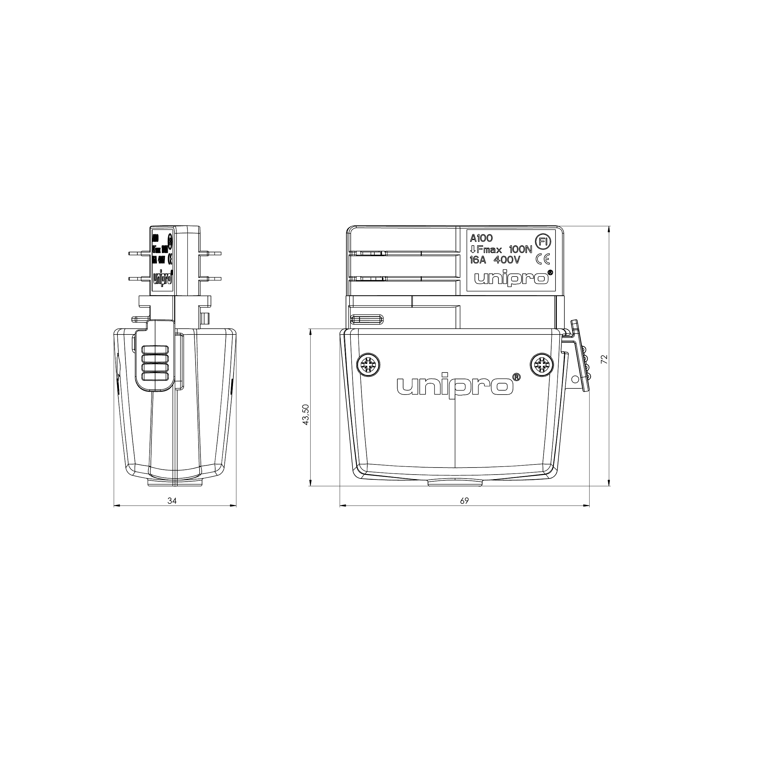 White power take off adapter for the unipro® T3 or TC3 Control-DALI lighting track. The unipro® A100 power output adapter is used for 1- or 3-phase devices or lighting fixtures.