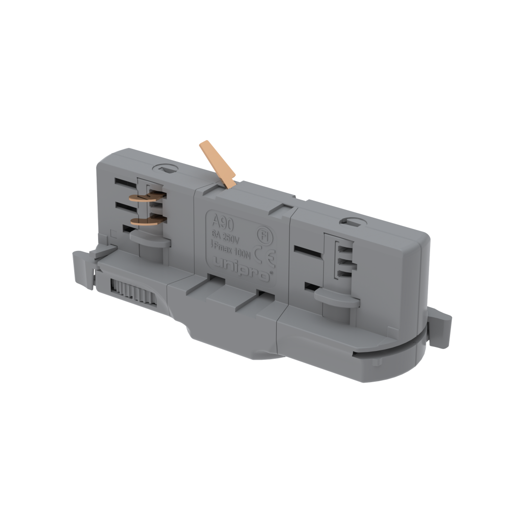Grey lighting track adapter. The unipro® A90 lighting adapter is used for spotlight installations. The unipro® A90 is designed to be compatible with most 3-phase lighting tracks and it has a bearing capacity of 10 kg.
