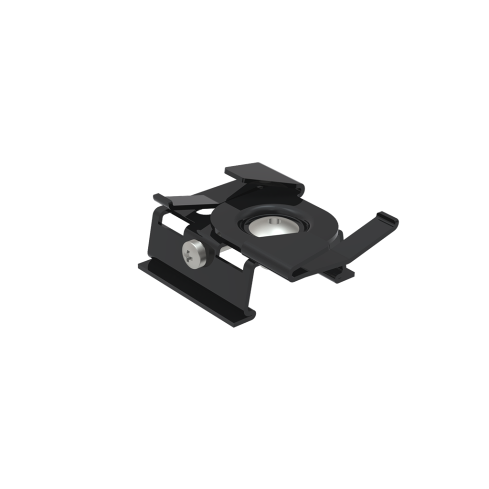 Black steel ceiling clamp for installing the lighting track onto a 24 mm T-bar on the ceiling.