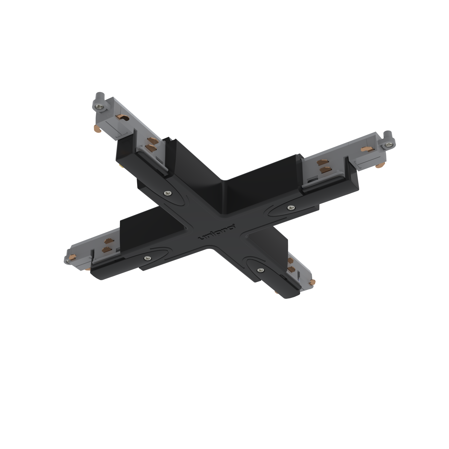 Black Control-DALI X piece for smooth connections between lighting tracks. The X piece is equipped with a power supply option. The black X piece connects dark tracks into an impressive entity.