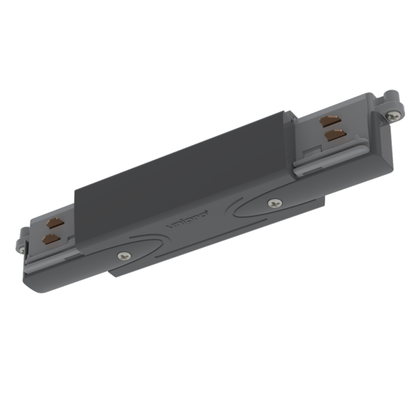 Grey central feeding unit for connecting lighting tracks and enabling power supply to the following track. Quick and easy to install.