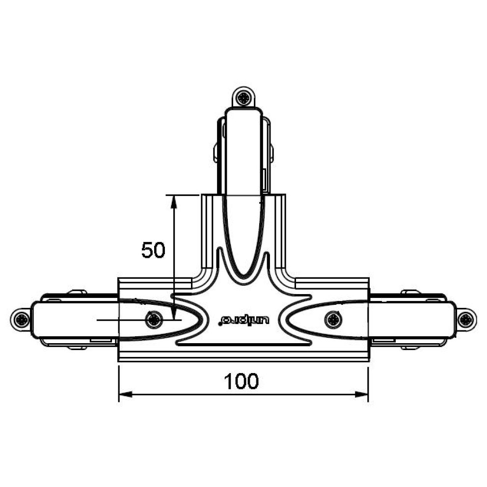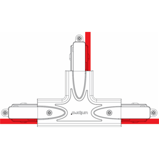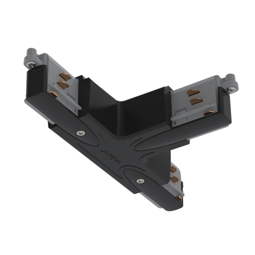 Black T piece for lighting track extensions and connections. The T piece is equipped with a power supply option, grounding D.